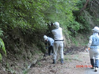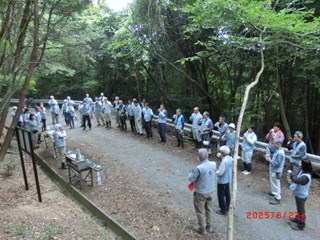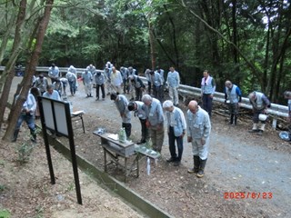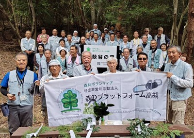 | 「奥萩谷の森除幕式及び森開き」を会員40名が参加して行いました。 奥萩谷の森は、森プラ設立20周年記念事業の一環として購入した山です。赤木理事長から「美しい高槻の森、手本となる森、多様性のある豊かな森にしましょう」と挨拶が、小柿理事からは、「これからの林業を担う見本となるような森を目指しましょう」との挨拶がありました。 そして除幕式で「奥萩谷の森」の看板をお披露目し、厳粛な雰囲気の中、お神酒奉納、玉串奉納、高木副理事長の発声により参加者全員で乾杯をして、森開きを終えました。 式典後は、林道付近の整備・側溝の泥さらいの作業を行い、汗を流すと共に、今回初参加の方は、敷地内を散策し、森の雰囲気を味わいました。 |