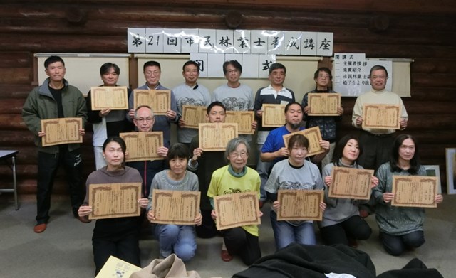 | 第20期市民林業士養成講座が、7月8日の開講式から無事全11講座を終えて、11月22日に閉講式を迎えることができました。 今回は、19名の受講生全員が新しく市民林業士として認定されました。 森プラへの新規加入者は、事情のある3名を除いて16名が新しい会員となりました。 また、養成講座第10期を修了された方1名が森プラへ新規加入されました。 閉講式終了後には、懇親会を兼ねた昼食会を開催し親交を深めました。 |